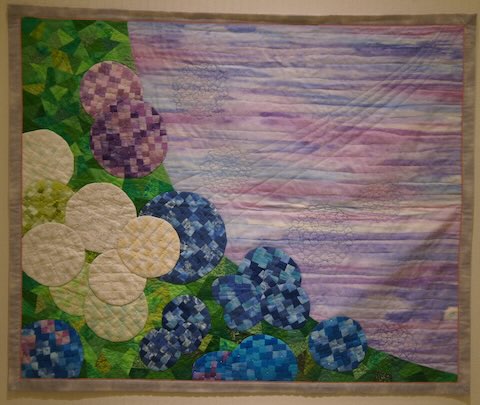 コメント: 同級生どうしのご夫婦 あじさいの咲く6月に彼女が旅立ち、5ヶ月後の11月には彼も天に召されました。 庭に咲くあじさいがお2人のように思われ在りし日の姿を偲びながらご冥福を祈りキルトしました。