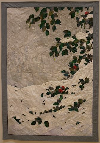 コメント: 降りしきるぼたん雪と木立、椿、忘れられない記憶がオーバーラップのテーマと重なりました。椿の葉を表現する為のピースワークに苦心惨憺し雪の色に悩み染色を繰り返しました。完成まで見守って下さり、本当にありがとうございます。