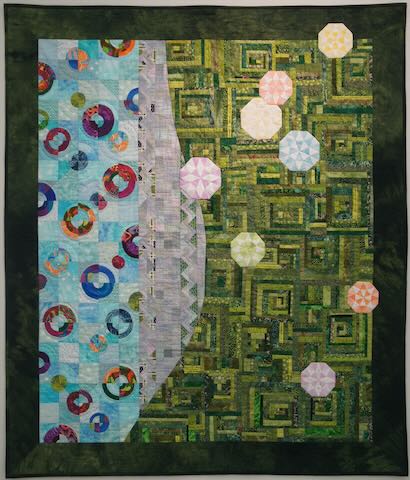 コメント: 楽しい布を使って「まる」に挑戦。「さんかく」を寄せて八角形。今までに出会った緑で大小「しかく」のログキャビンを作ってみました。
