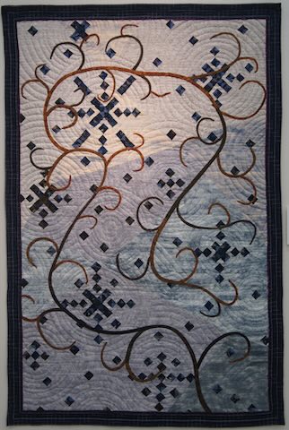 コメント: 唐草模様が好き。どこまでも伸びてゆく蔓。パターン集(ステックダイヤモンド)から藍の花が出来ました。